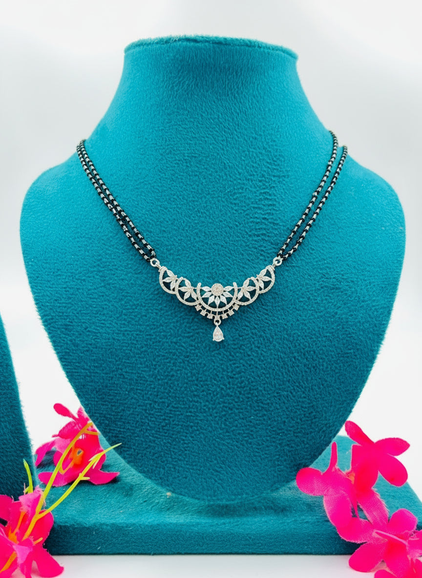 Elevate your bridal and daily look with this Designer Silver Premium Mangalsutra. The intricate pendant, crafted with precision, adds a touch of luxury while the classic black-bead pattern preserves its traditional essence. A perfect fusion of grace and craftsmanship.