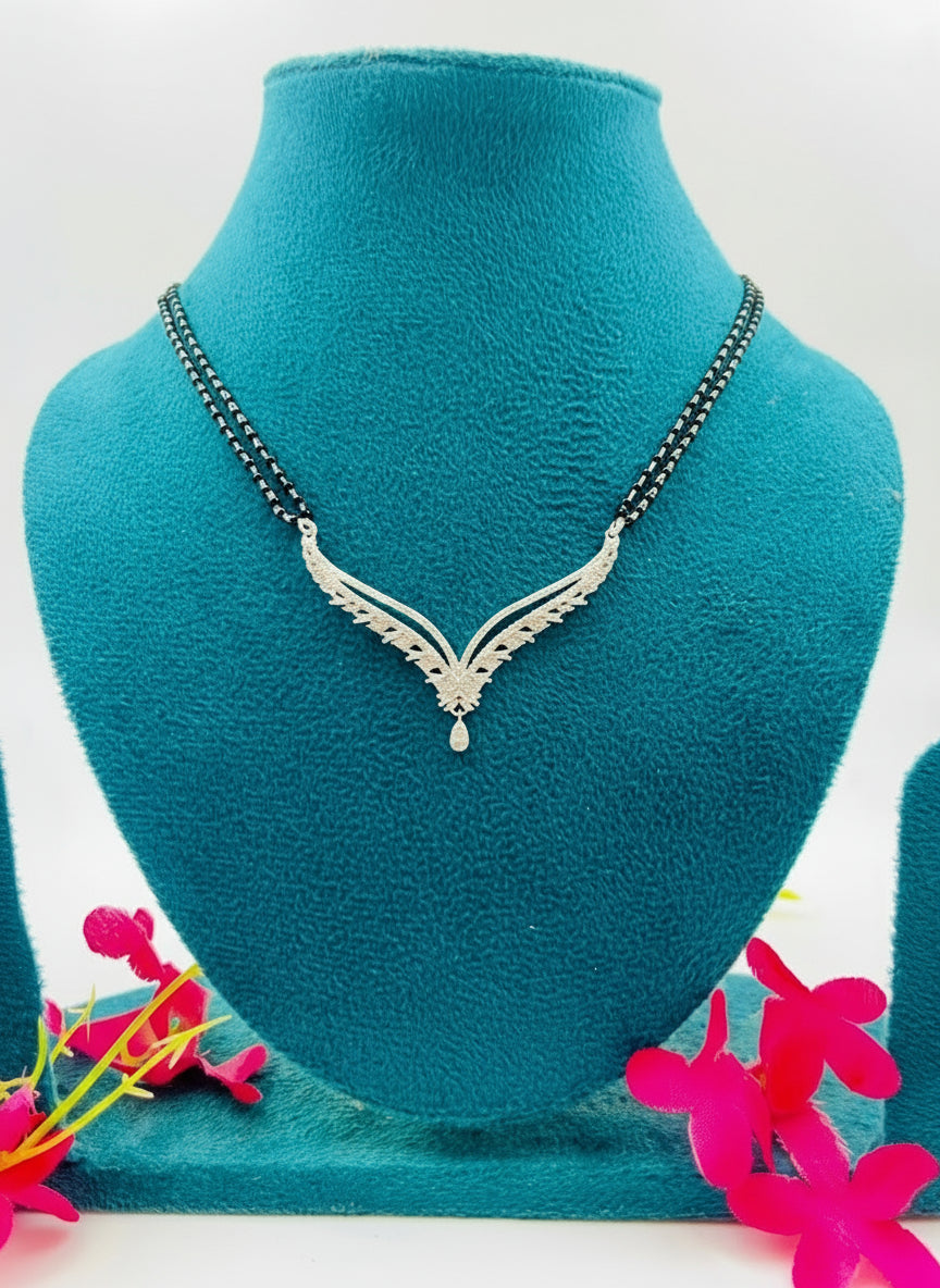 Elevate your bridal and daily look with this Designer Silver Premium Mangalsutra. The intricate pendant, crafted with precision, adds a touch of luxury while the classic black-bead pattern preserves its traditional essence. A perfect fusion of grace and craftsmanship.