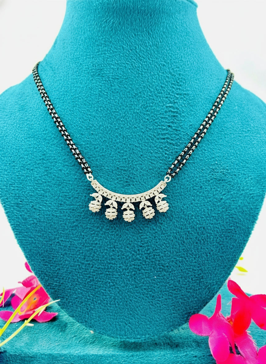 Elevate your bridal and daily look with this Designer Silver Premium Mangalsutra. The intricate pendant, crafted with precision, adds a touch of luxury while the classic black-bead pattern preserves its traditional essence. A perfect fusion of grace and craftsmanship.