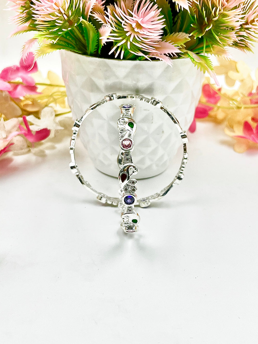 These silver bangles feature clean lines and a smooth finish for a look that’s simple, stylish, and versatile. Designed to be stacked or worn solo, they add a subtle gleam to the wrist without overpowering your style. Perfect for minimalists who appreciate understated beauty.
