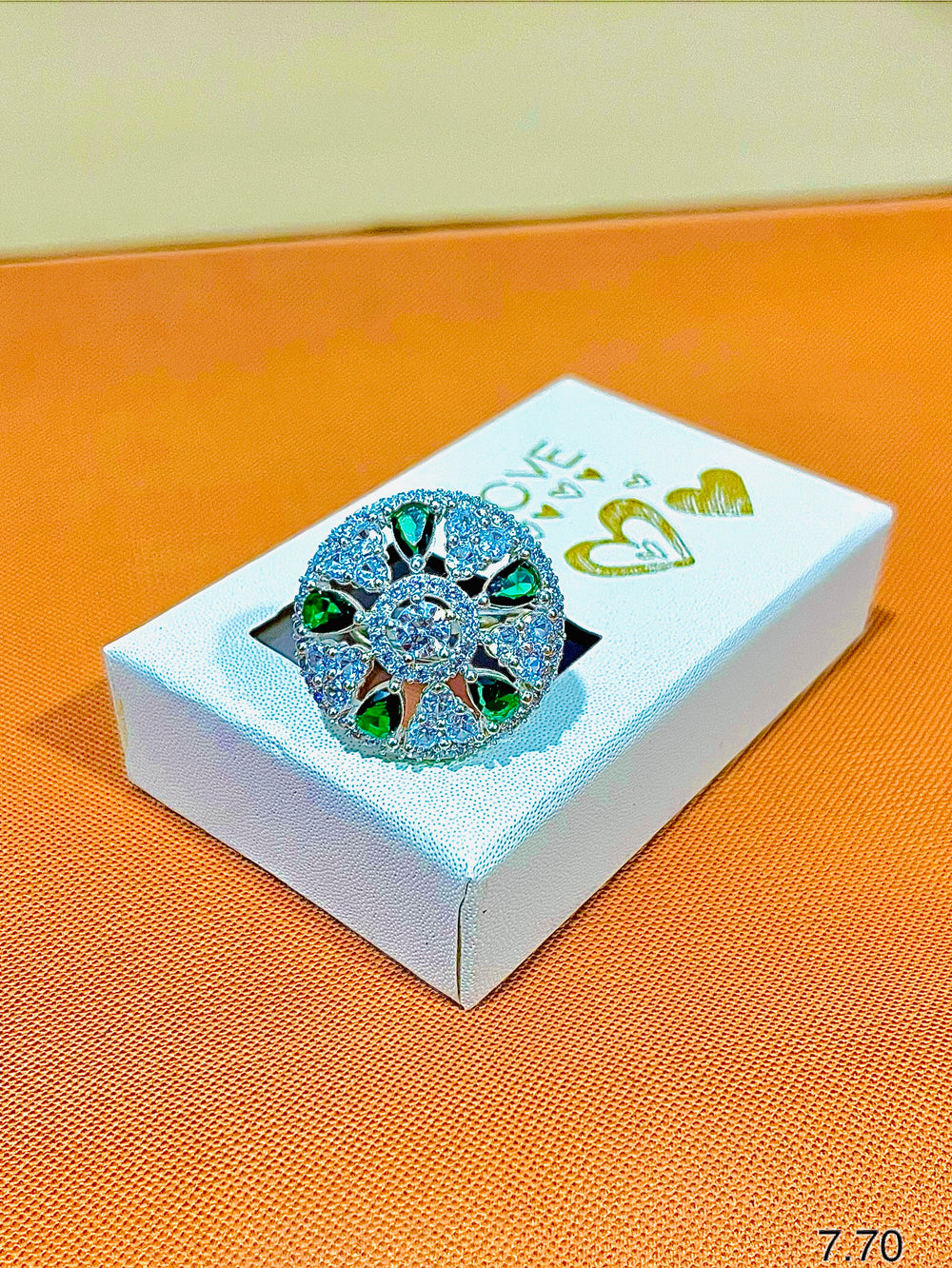 This beautiful ring features a stunning combination of vibrant multi-colour stones arranged in a floral-inspired circular design. The center is highlighted with rich green and pink stones, surrounded by sparkling white and magenta stones that enhance its luxurious appeal. The fine craftsmanship and polished finish give the ring a premium and glamorous shine.