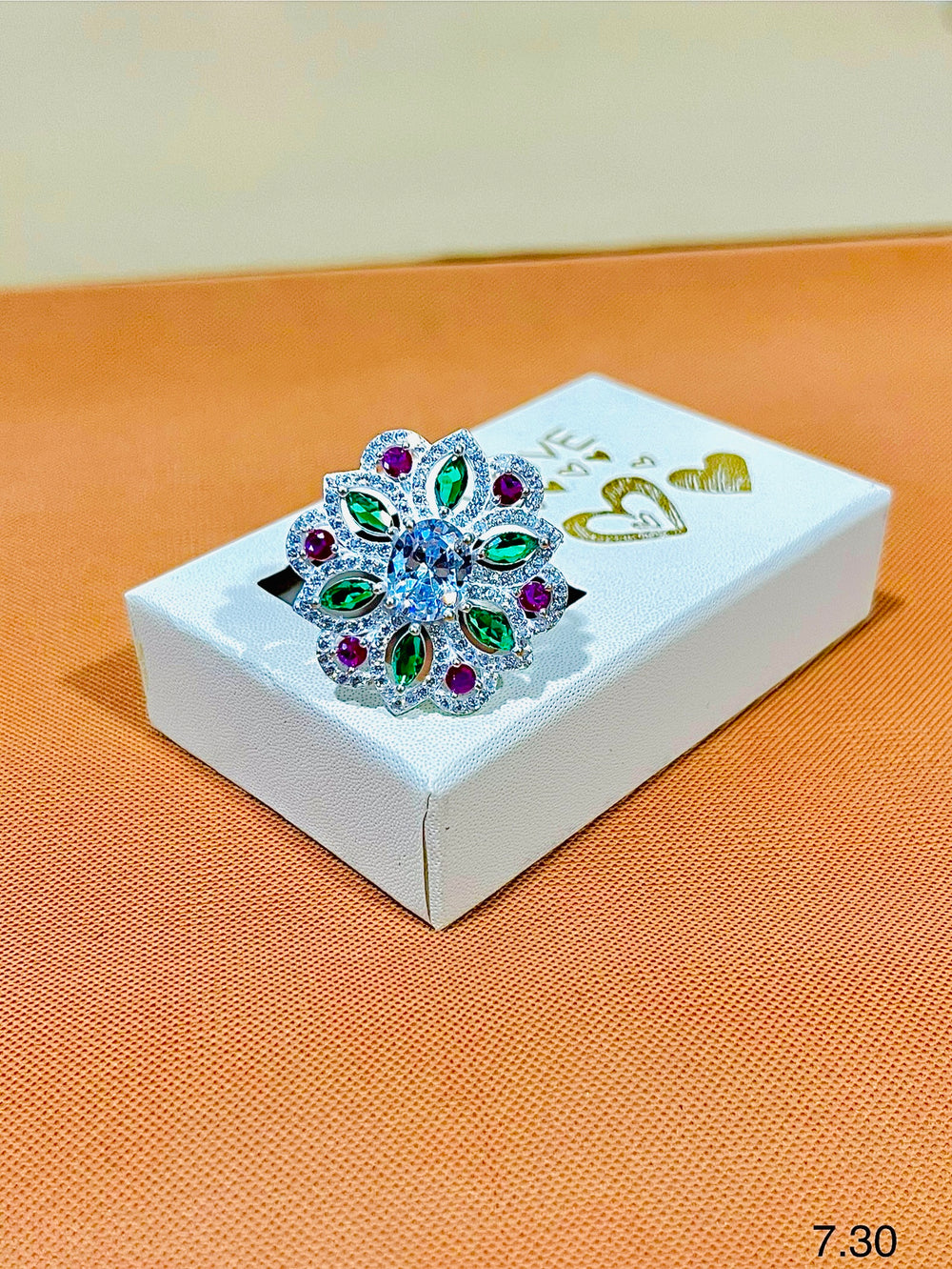 This beautiful ring features a stunning combination of vibrant multi-colour stones arranged in a floral-inspired circular design. The center is highlighted with rich green and pink stones, surrounded by sparkling white and magenta stones that enhance its luxurious appeal. The fine craftsmanship and polished finish give the ring a premium and glamorous shine.