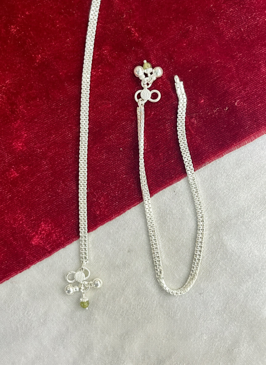 Adorn your feet with the timeless charm of this exquisite Silver Payal, crafted with pure sterling silver and intricate detailing. Designed to capture grace in every step, this anklet combines traditional artistry with a touch of modern sophistication. The gentle jingle of silver bells adds a melodic rhythm, making it perfect for festive occasions or daily wear.